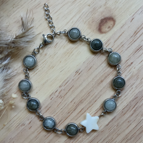 Ce bracelet allie simplicité et mystère : de fins cabochons de labradorite montés sur argent, sublimés par une étoile blanche en son centre. Même sans reflets, la labradorite conserve toute sa puissance, telle une force silencieuse qui protège et accompagne au quotidien.